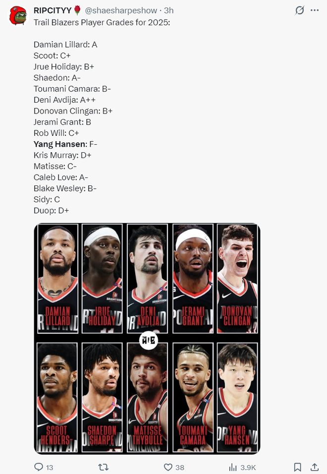 开拓者媒体Ripcityy为开拓者众将的2025年进行了评分:(杨瀚森是最差的那个) 利拉德A(没出战过); 亨德森C+; 霍勒迪B+; 夏普A-; 卡马拉B-; 阿夫迪亚A++; 克林根B+; 格兰特B; 罗威C+; 杨瀚森F-; 穆雷:D+; 乐福A-; 韦斯利B-; 里斯D+; 塞布尔C-; 西索科C;