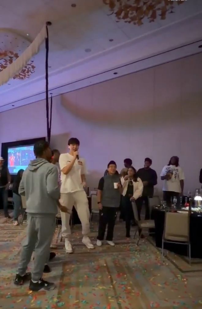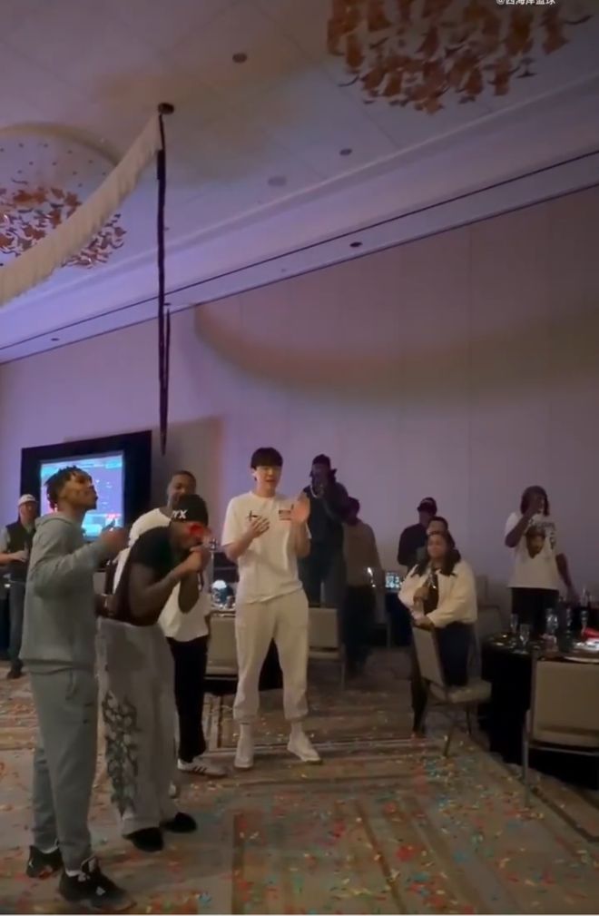 按照NBA的传统,新秀乐福领唱生日歌,杨瀚森同为新秀也在一旁跟着唱。