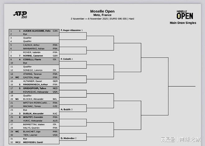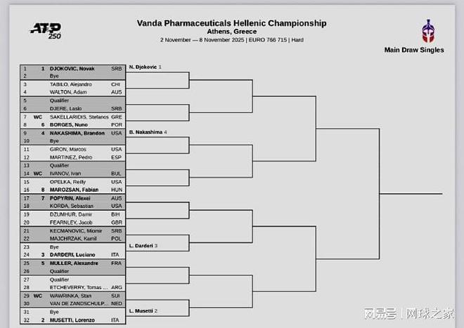 我们再来关注下周赛事。北京时间昨晚,下周的两站ATP250室内硬地赛公布了正赛签表。雅典站:德约科维奇、穆塞蒂、达尔德里、中岛-布兰登领衔出战;梅兹站:阿利亚西姆、梅德维德夫、布勃里克、科博利位列前四种子。需要说明的是,雅典站由原贝尔格莱德站迁址更名而来,原因是ATP运营标准限制及德约科维奇已定居雅典,而且赛事总监是德约科维奇的弟弟乔尔杰。‌‌