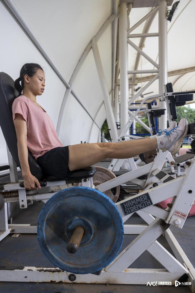 在训练场器械区,莫家蝶进行自我训练,跳起来腾空相当高。