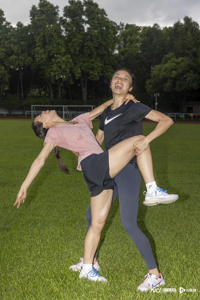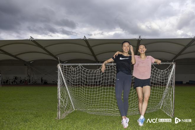 训练结束,在田径场跑道中间的草地上散步调整,莫家蝶与队友曾蕊应记者的要求合照,笑得开怀。
