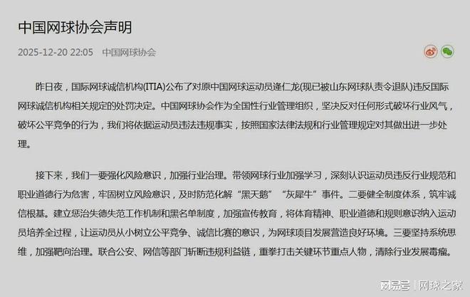 我们再来关注中国球员违规遭处罚事件。一天前,国际网球诚信机构(ITIA)确认,中国网球运动员逄仁龙因操纵或企图操纵比赛,被处以禁赛12年并罚款11万美元(其中7万美元暂缓执行)的处罚。随后,中国网球协会发声明,对这一事件表态。