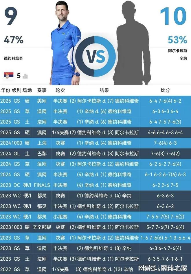 到了上赛季,辛纳和德约在大满贯硬地赛事上有了首次交锋。这次是在澳网半决赛上,辛纳首次杀进澳网四强,而德约则是来到了个人最熟悉的轮次——只要打进澳网四强,他还从来没有丢过最终的冠军。但纪录就是被用来打破的,辛纳全场比赛没有送出一记破发点,最终赢下了这场颇具意义的较量。 去年的上海大师赛决赛,双方再次相遇,尽管过往德约在这项赛事中的夺冠率相当高,但面对已经如日中天的对手,还是只能甘拜下风。目前两人在硬地赛场的交锋是辛纳3-1领先德约。