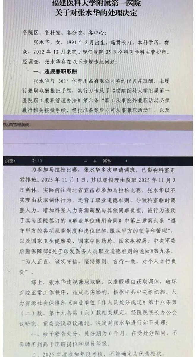 12月10日,福建医科大学附属第一医院通报,“我院依规依纪对张水华违规兼职取酬、以虚假理由获取调休问题进行处理。我院重申,在遵纪守法、不影响本职工作的前提下,鼓励员工发展个人兴趣爱好。”